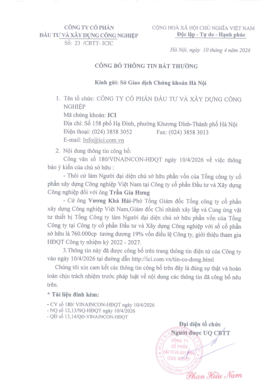 Nghị quyết và biên bản đại hội đồng cổ đông năm 2020 Công ty CPĐT và xây dựng công nghiệp (mã ICI)