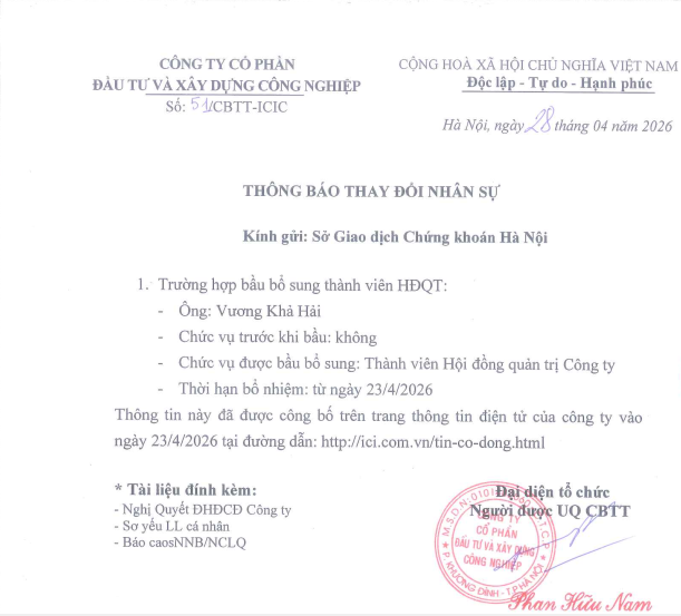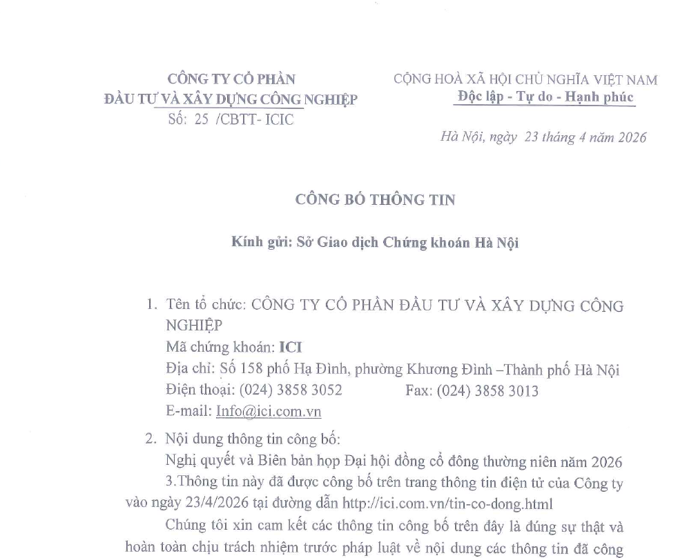 Chi tiếtNghị quyết và biên bản đại hội đồng cổ đông năm 2020 Công ty CPĐT và xây dựng công nghiệp (mã ICI)